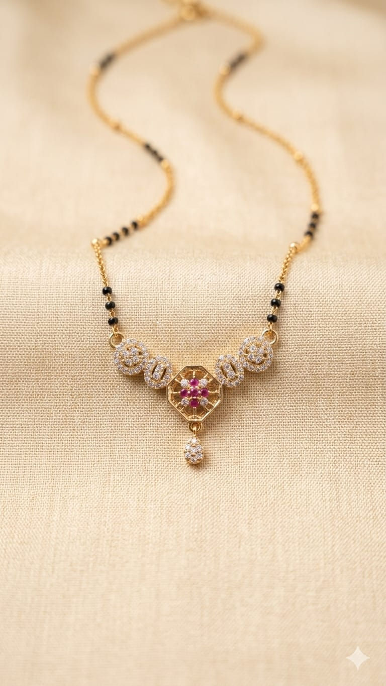18K Gold Plated Diamond Mangalsutra with Ruby Floral Pendant